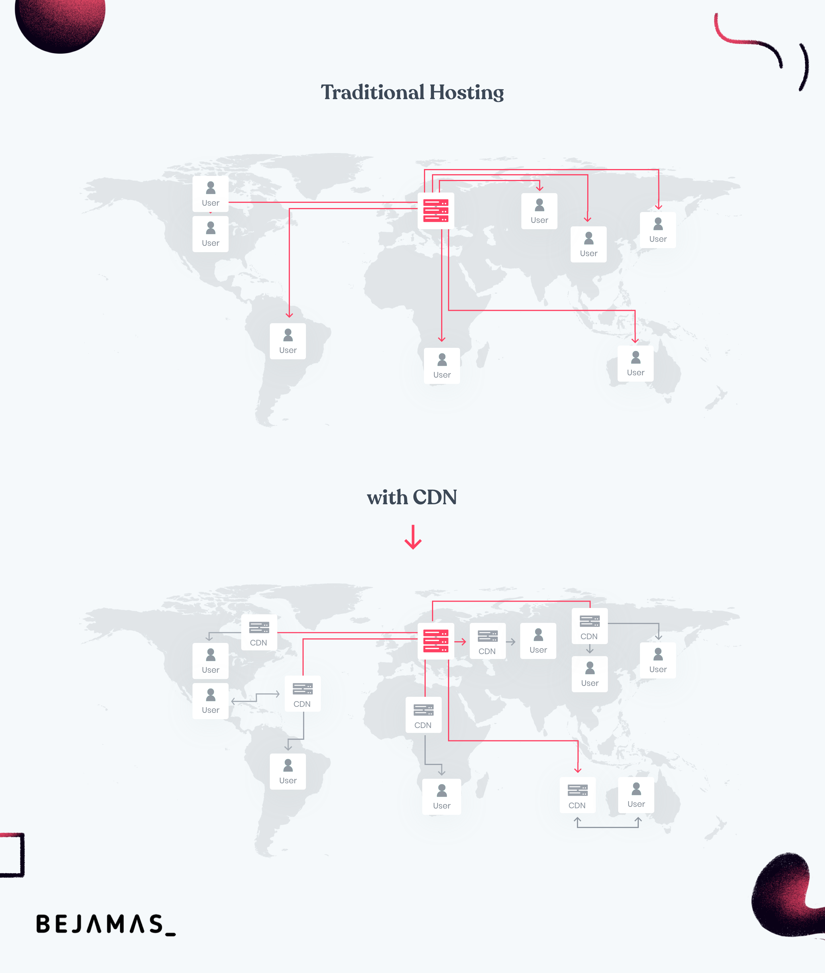 Traditional hosting solutions, be it shared or dedicated, are tied to a single data center where your website is hosted. No matter if a user comes from Japan, the UK, or the Bahamas he is always served from the same location making your website slower for users coming from locations that are far away from where your website is located.