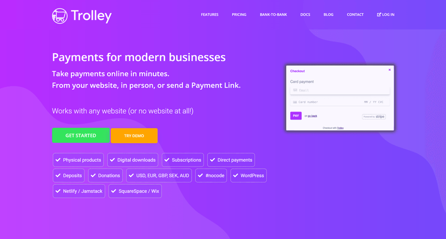 Trolley is perhaps one of the simplest payment platforms on the market. Head to the official site to try their demo and see for yourself! You can get paid in a matter of minutes and with a few options - from your website, in person, or via a link.