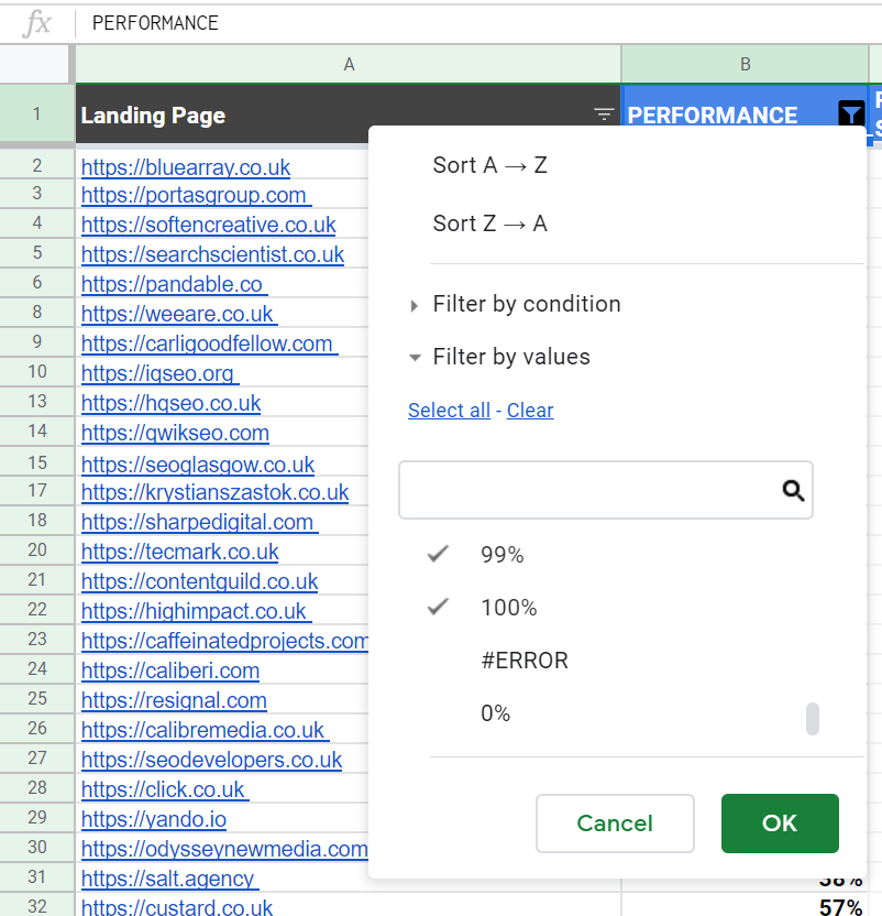 If the website did not run on HTTPS, the script would return results as #ERROR, and that screwed calculations of the average result. Running a filter that would exclude #ERROR and 0% results helped.