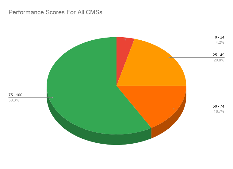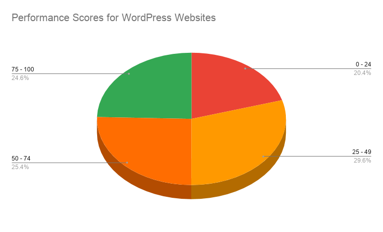 Performance score vise 79.3% of WordPress run websites have a poor or slightly above poor Lighthouse performance score ie 0-50. Only 5.1% of WordPress run websites have good performance scores ie 75-100.