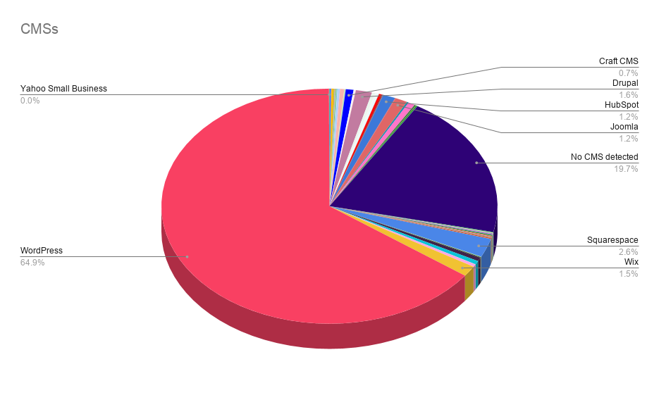 While WordPress globally rules the CMS space with 60.8% of the market share our research shows 64.9% in favor of WordPress when our sample of web dev, SEO, and marketing agencies websites is concerned.