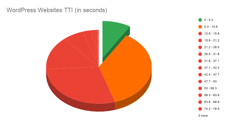 8.71% (826 websites) of tested WordPress websites have fast TTI score 0–5.2s. 3446 websites have moderate TTI scores and the rest are just no good.